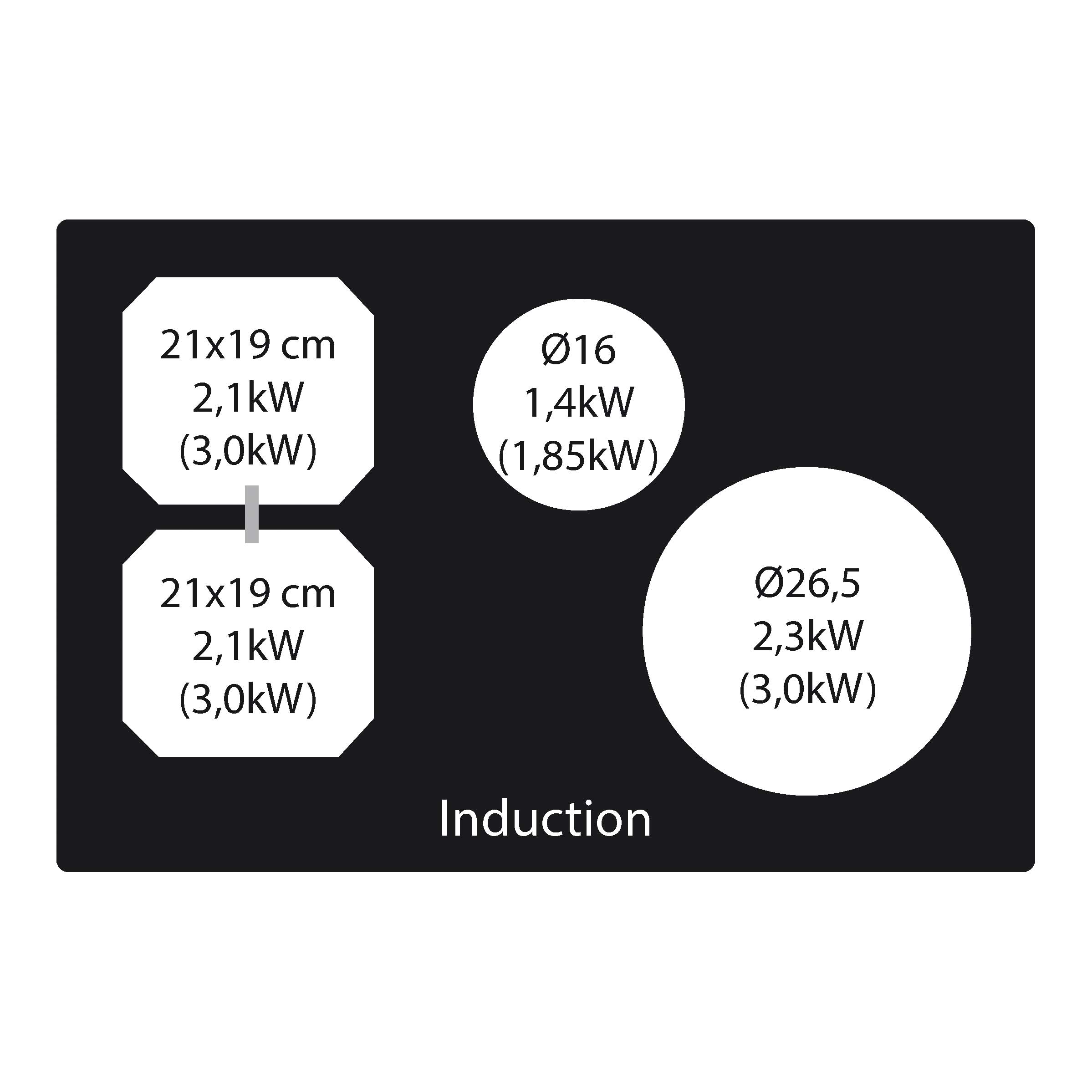 I venstre side kan fremre sone og bakre sone kobles sammen til én kokesone på 21x38 cm