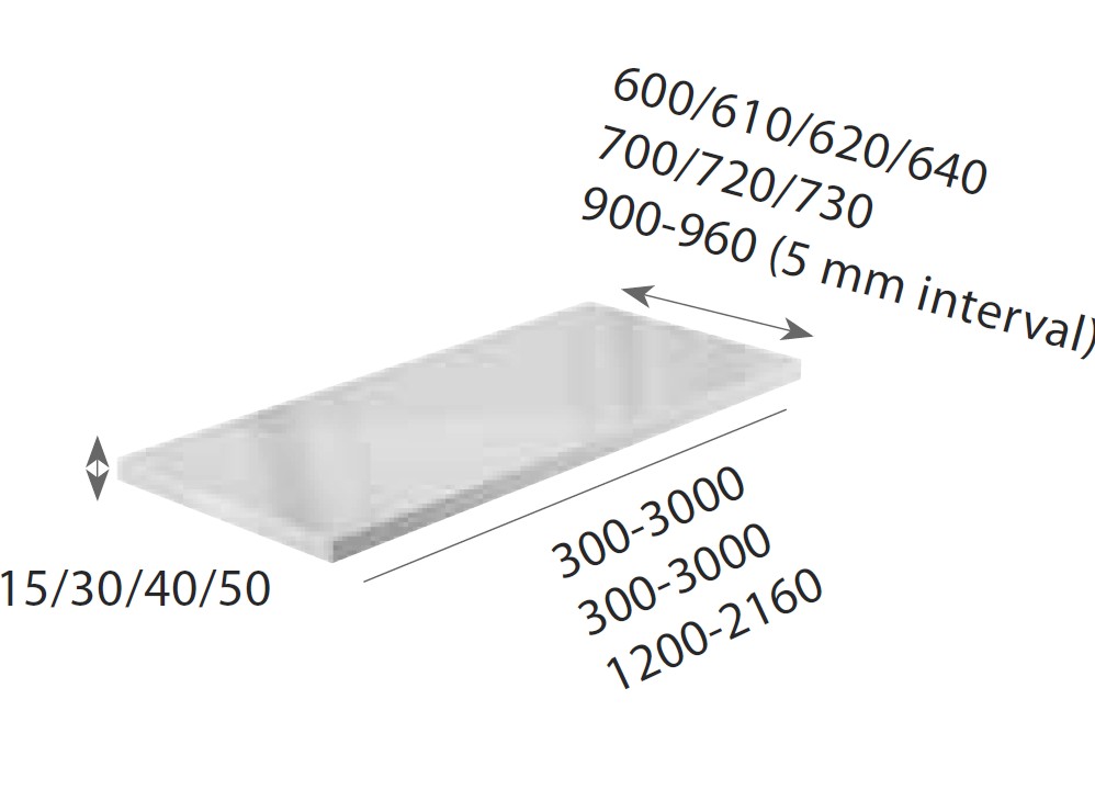 Stålbenk 600, Stålbenkeplate etter mål. Stålbenk uten kum. Benkeplatens lengde kan velges med en halv centimeteres intervall. Plan eller opphøyet kantprofil Ikke opphøyet for benkeplater i 15 mm tykkelse. Overflaten er glatt. Kan leveres i variant med integrert bakkant Kanten er 10 mm tykk og 40 mm høy