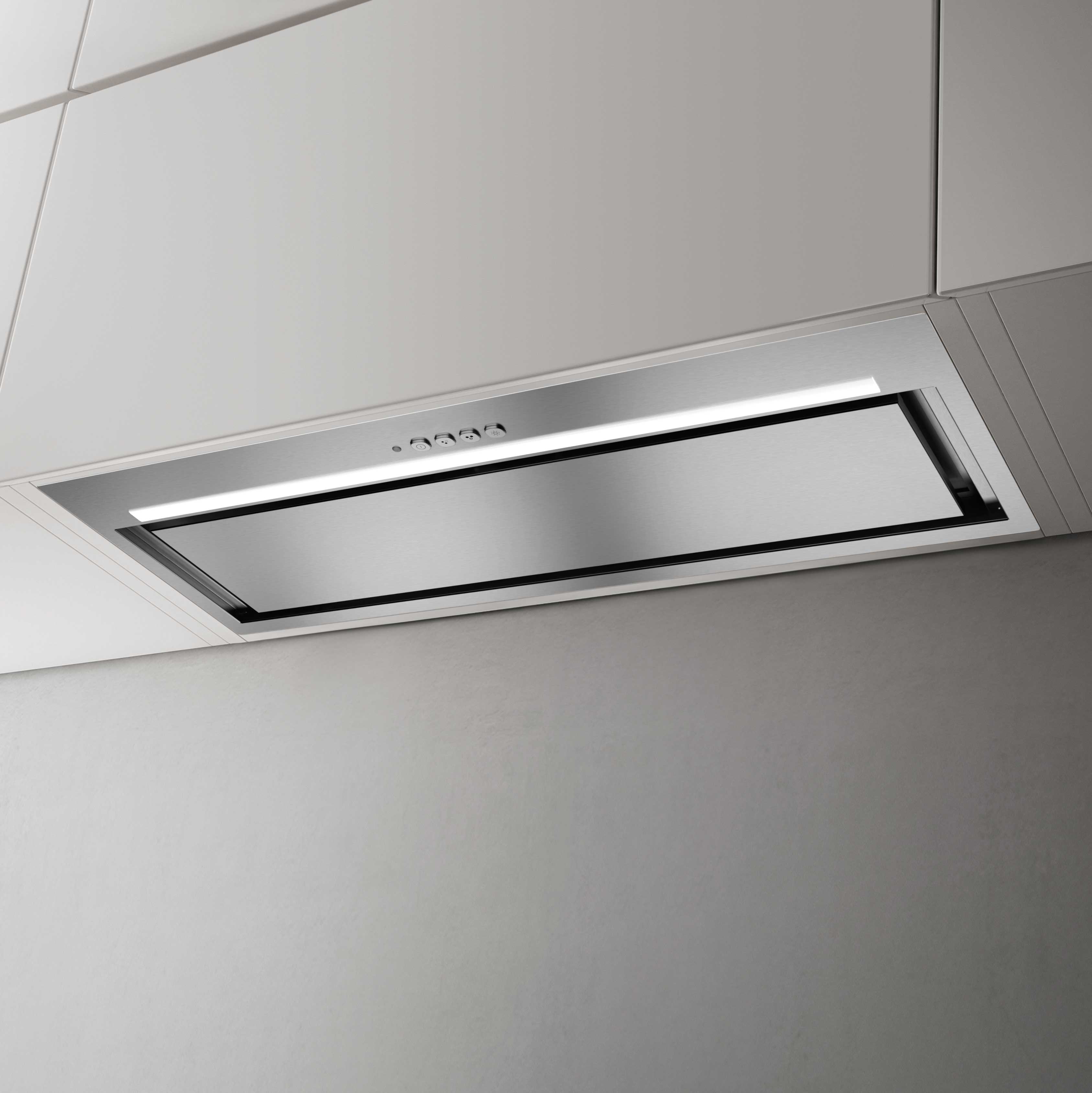Integreret rustfri emhætte til indbygning under overskab – med kantsug og LED-lys