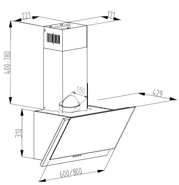 Veggmontert hette, skråstilt. Med innebygget motor - Grey Stone - 800 mm - A++
